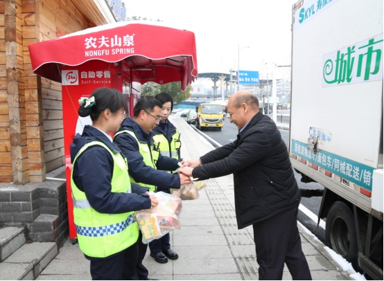在十堰高速路出入口,志愿者向高速服务站工作人员和正在休息的司机发放热饮和面包、鸡蛋等物资。在柳林沟口交警岗亭,十堰市总工会的志愿者向坚守在交通要道的交警表达感谢。在环卫局服务中心工会驿站,当温热的礼包送到环卫工人、快递小哥手中时,大家脸上露出朴实的笑容,纷纷表示将全力保障城区环境卫生与路面通行安全,为城市安全运行保驾护航。