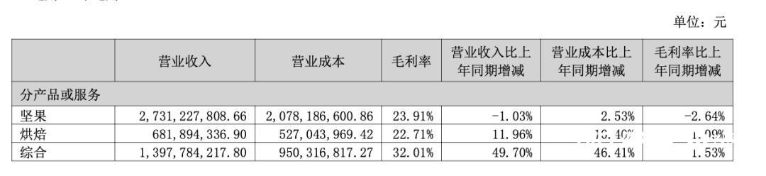 分产品来看,今年上半年,其坚果收入同比下跌了1.03%至27.31亿元,综合产品收入同比增长49.70%至13.98亿元,烘焙产品收入同比增长了11.96%至6.82亿元。而在毛利率层面,今年上半年,其坚果下跌了2.64%至23.91%;综合产品毛利率同比增长了1.53%至32.01%,烘焙产品毛利率同比增长了1.09%至22.71%。