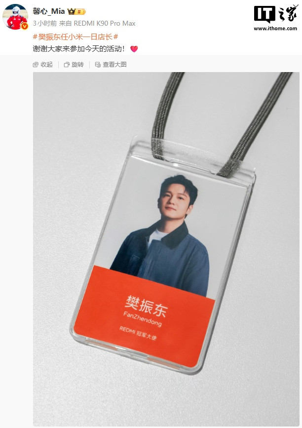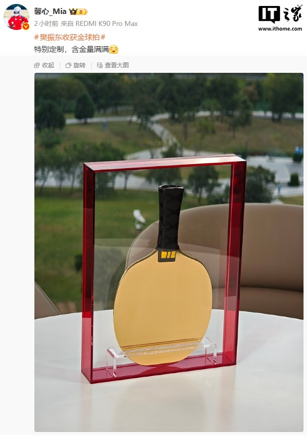 IT之家11月24日消息,今日,REDMI冠军大使樊振东到小米之家深圳小米大厦店当一天店长,REDMI产品经理胡馨心透露,樊振东收获一副特别定制金球拍,含金量满满。