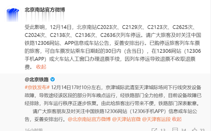 随后,天津火车站官方微博@天津站官微、中国铁路北京局集团有限公司北京南站官方微博@北京南站官方微博发布消息称: