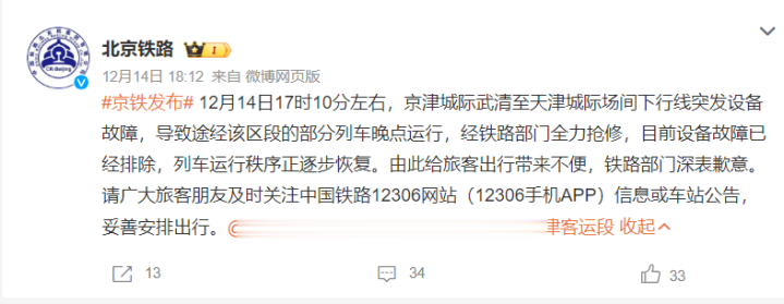 14日18:12,中国铁路北京局集团有限公司官方微博@北京铁路发布消息称,12月14日17时10分左右,京津城际武清至天津城际场间下行线突发设备故障,导致途经该区段的部分列车晚点运行,经铁路部门全力抢修,目前设备故障已经排除,列车运行秩序正逐步恢复。由此给旅客出行带来不便,铁路部门深表歉意。请广大旅客朋友及时关注中国铁路12306网站(12306手机APP)信息或车站公告,妥善安排出行。