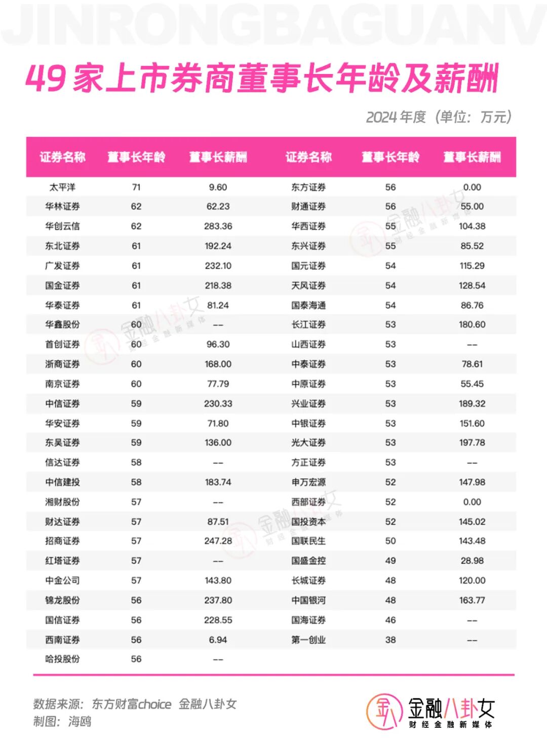 还有,这49家上市券商的董事长,即将迎来一批退休潮,其中超过60岁的已经有11位,超过55岁的有29位,大半都距离退休不远了。这批董事长里面,年薪超过200万的有7位,年薪超过100万的有17位,钱还是不少挣的。