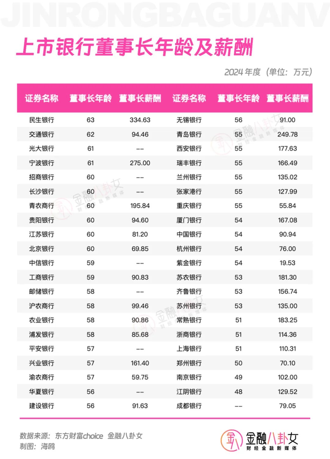 上市银行的董事长,年龄分布跟券商也差不多,集中在55岁上下,有10位董事长不低于60岁,有2位董事长低于50岁。年薪过百万的上市银行董事长,有18位,其中年薪最高的三名分别是民生银行、宁波银行和青岛银行的董事长,分别为334.6万元、275万元、250万元。