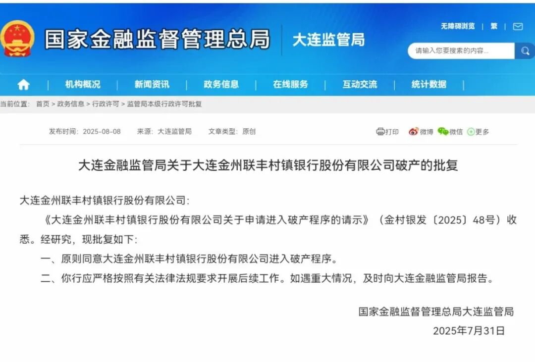 2025年8月8日,国家金融监管总局大连监管局发布了《大连金融监管局关于大连金州联丰村镇银行股份有限公司破产的批复》。