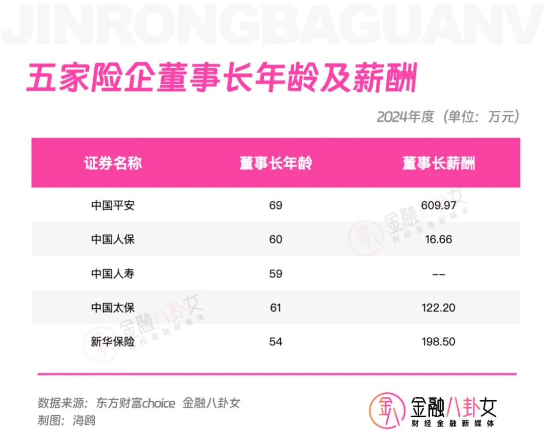 从董事长的情况来看,保险公司就显得比较老了,平安的董事长已经69岁,太保和人保的董事长也都过60了。不过,姜还是老的辣,最年长的平安董事长拿着610万的高薪,太保和新华的董事长也都年薪超过百万。
