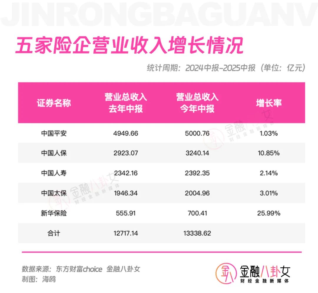 2023年、2024年、2025年的中报中,五家险企的营业总收入合计分别为1.18万亿、1.27万亿、1.33万亿,保持着稳健的增速。