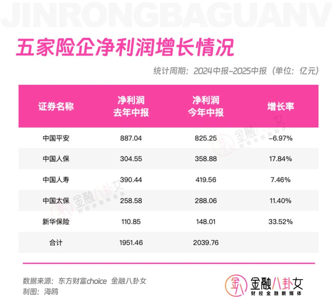 2023年、2024年、2025年的中报中,五家险企的净利润合计分别为1735亿、1951亿、2040亿,也保持着稳健的增速。