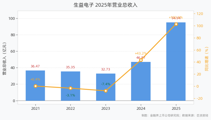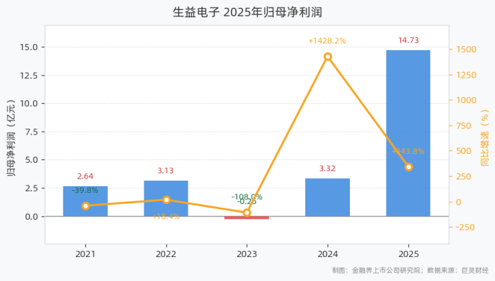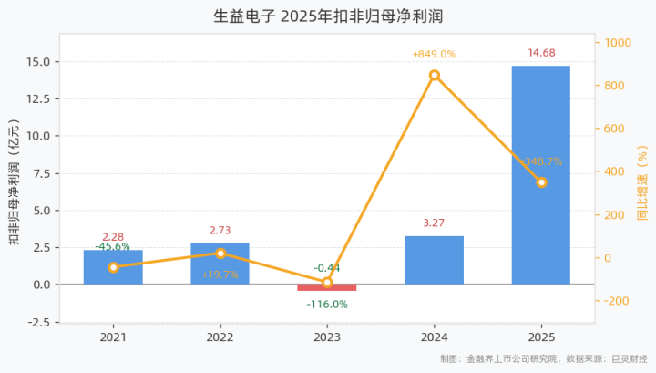 4月23日,生益电子发布2025年年报。报告显示,2025年公司实现营业总收入94.94亿元,同比增长102.57%;实现归母净利润14.73亿元,同比增长343.76%;实现扣非归母净利润14.68亿元,同比增长348.72%;基本每股收益为1.80元,加权平均净资产收益率为29.74%;经营活动产生的现金流量净额为16.21亿元,同比增长362.22%。